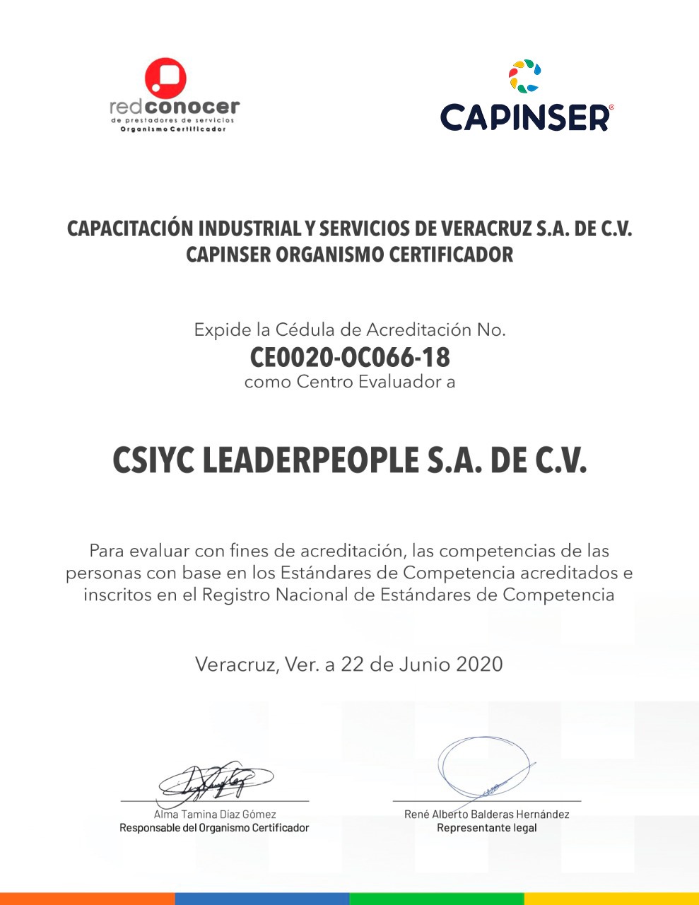 CENTRO EVALUADOR DEL ORGANISMO CERTIFICADOR CAPINSER CÉDULA DE ACREDITACIÓN CE0020-OC066-18 CSIYC ESTÁNDARES ACREDITADOS EC0217.01 EC0301 EC0307.01 EC0680